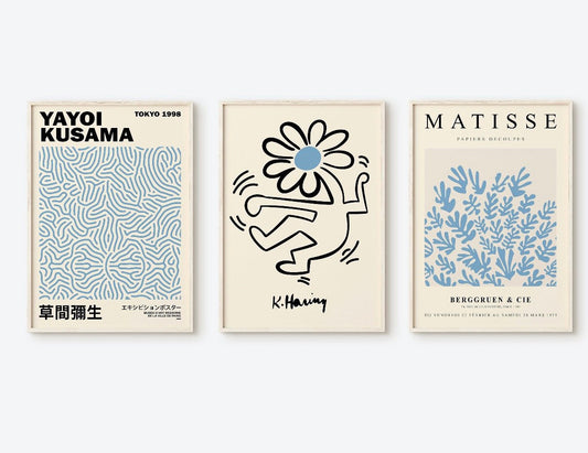 Keith Haring Exhibition set of 3 Matisse | Yayoi Kusama prints | famous artists wall art | blue wall art